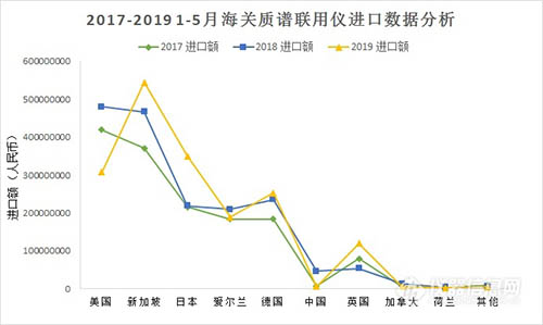 當前,中國市場上的商品化的質譜聯用儀還是以進口為主,質譜聯用儀的進口情況在一定程度上,也反映了我國目前質譜聯用儀整體市場的一些情況。從2018年3月,中美貿易戰打響,對整個科學儀器市場產生重大影響。質譜聯用儀作為一類重要的科學儀器,在貿易戰中到底受到了怎樣的影響也備受關注。為此,儀器信息網特別對2017、2018年及2019年1-5月,海關質譜聯用儀進口數據進行了匯總分析,為大家了解中國目前質譜聯用儀市場做一個參考。