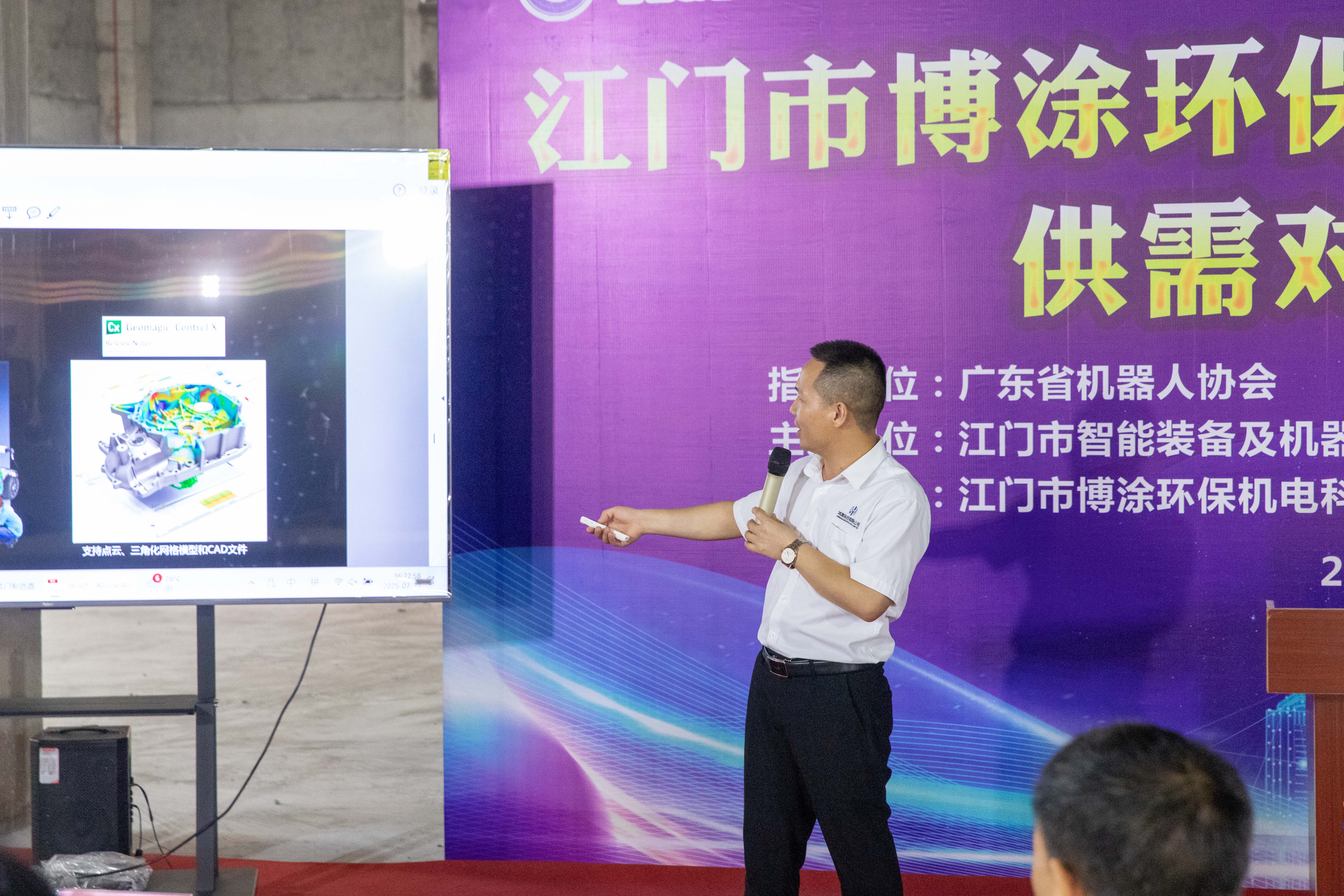 本次交流會(huì)精準(zhǔn)邀約27家企業(yè)參與,覆蓋智能裝備、機(jī)器人、五金配件等多元領(lǐng)域,匯聚行業(yè)智慧與資源,為產(chǎn)業(yè)交流合作注入活力。活動(dòng)得到廣東省機(jī)器人協(xié)會(huì)指導(dǎo)支持,由江門市智能裝備及機(jī)器人協(xié)會(huì)、江門市智能機(jī)器人產(chǎn)業(yè)技術(shù)創(chuàng)新聯(lián)盟、江門市博涂環(huán)保機(jī)電科技有限公司聯(lián)合舉辦。江門市新會(huì)區(qū)大澤鎮(zhèn)經(jīng)濟(jì)辦主任徐力超先生、新洲美谷科技工業(yè)園領(lǐng)導(dǎo)任建軍先生、江門市智能裝備及機(jī)器人協(xié)會(huì)執(zhí)行會(huì)長王建生教授、江門市博涂環(huán)保機(jī)電有限公司總經(jīng)理李興華先生等領(lǐng)導(dǎo)出席本次交流會(huì)。與會(huì)企業(yè)代表先后進(jìn)行推介,圍繞企業(yè)發(fā)展歷程、產(chǎn)品研發(fā)和生產(chǎn)智造實(shí)力等方面展開分享,并在現(xiàn)場展開熱烈交流,共探合作機(jī)遇。公司總經(jīng)理許高云先生上臺(tái)推介公司總代理產(chǎn)品-法國科瑞朗公司(Kreon Technologies)關(guān)節(jié)臂三坐標(biāo)測量儀。